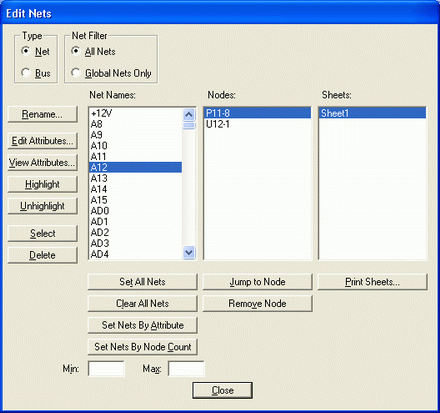 Edit/Nets автоматически выбирается тип шины и окно Net Filter Box